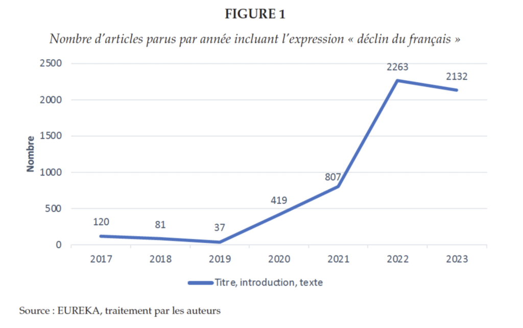 Selon Therrien et Marcoux (2025), ces dernières années ont marqué un tournant majeur dans la couverture médiatique des enjeux linguistiques au Québec. En effet, l’expression « déclin du français » s’est imposée dans les médias franco-canadiens entre 2017 et 2023, avec un pic manifeste en 2022, année marquée par la création du ministère de la Langue française et la campagne électorale de la CAQ.